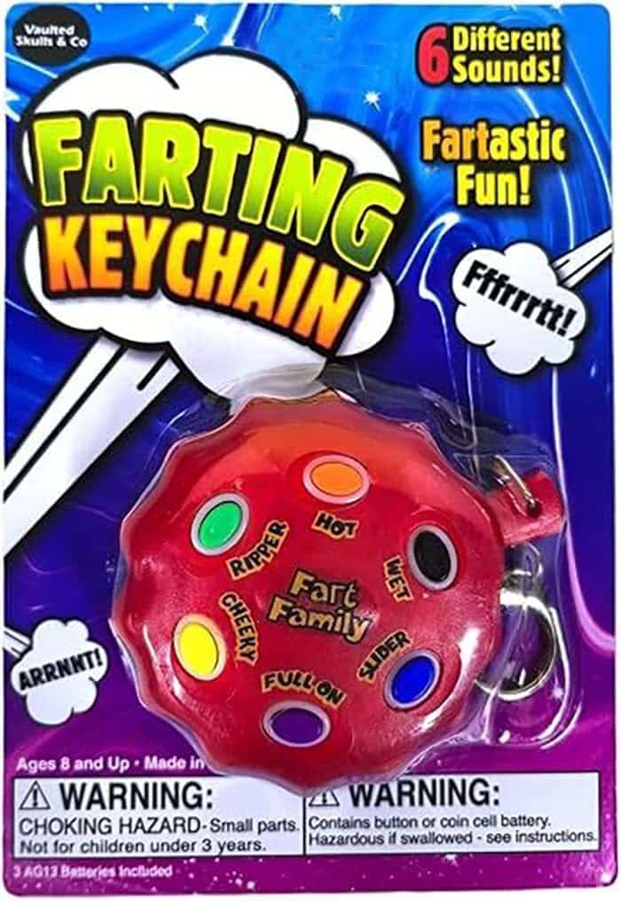 The latest in the ClassicStupid.com Flatulence Department is the “Farting Keychain” — This handy electronic device looks sort of like a whoopie cushio, but has six buttons. Each button triggers a different sort of fart —
