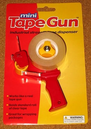 The Mini Tape Gun comes in assorted colors and includes a full roll of adhesive tape. So buy one, then stop by the Shipping Department. You can show them your teeny-weeny tape gun, and they can show you their teeny-weeny paychecks.